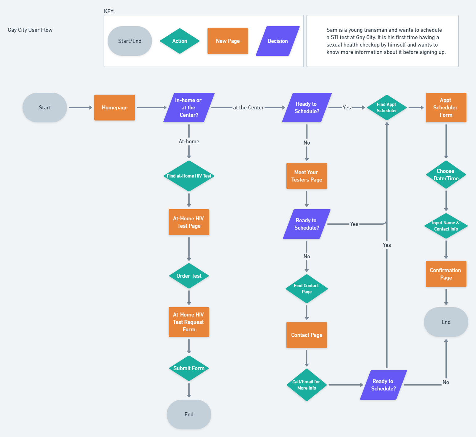As Gay City is King County’s largest distributor for HIV/STI Testing, booking appointments online is an essential feature to their online services. Additionally, their key demographics that use their services are trans-identifying youth, so staying approachable and personable was a key factor in redesigning this process flow. Demonstrated is the main appointment scheduler flow.