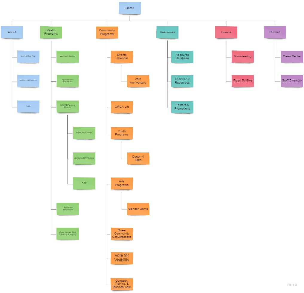 To solve for the first pain point of navigational issues, I conducted an open card sort to comprehend how most user’s would group together various categories from the list of Gay City’s current resources. An easy to navigate website did not only benefit users, it also would be highly beneficial to Gay City to serve their community. From the results, I was able to synthesize the site map using Miro which acted as our base foundation for the website as pictured below.