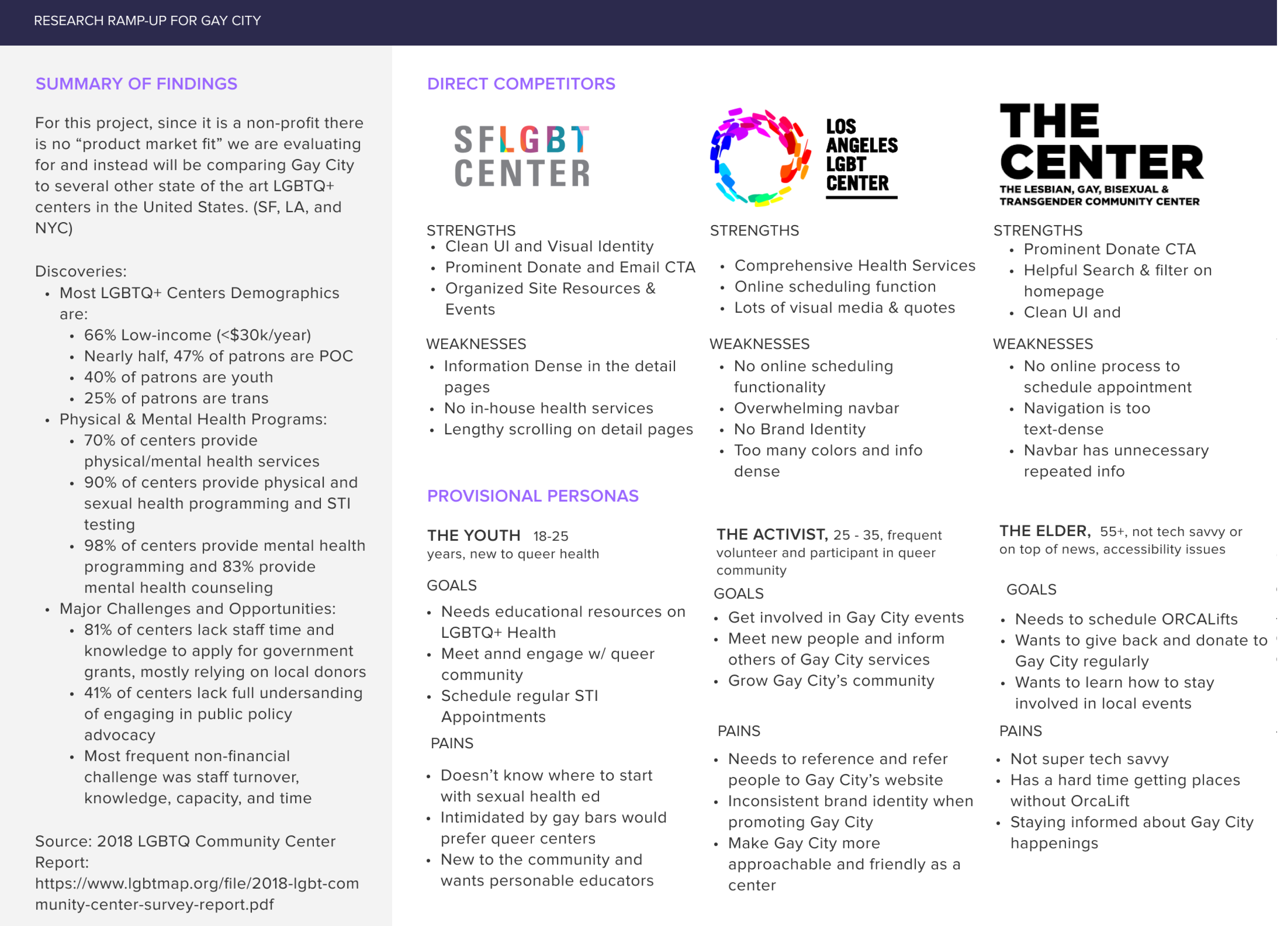 In order to understand how Gay City can become accessible and user friendly to all audiences and what features or services are important so that we can streamline Gay City’s digital presence. I utilized a variety of user research methodologies including secondary research of LGBTQ+ community centers of major cities, existing site analytics, community mailing surveys, and one on one interviews to: