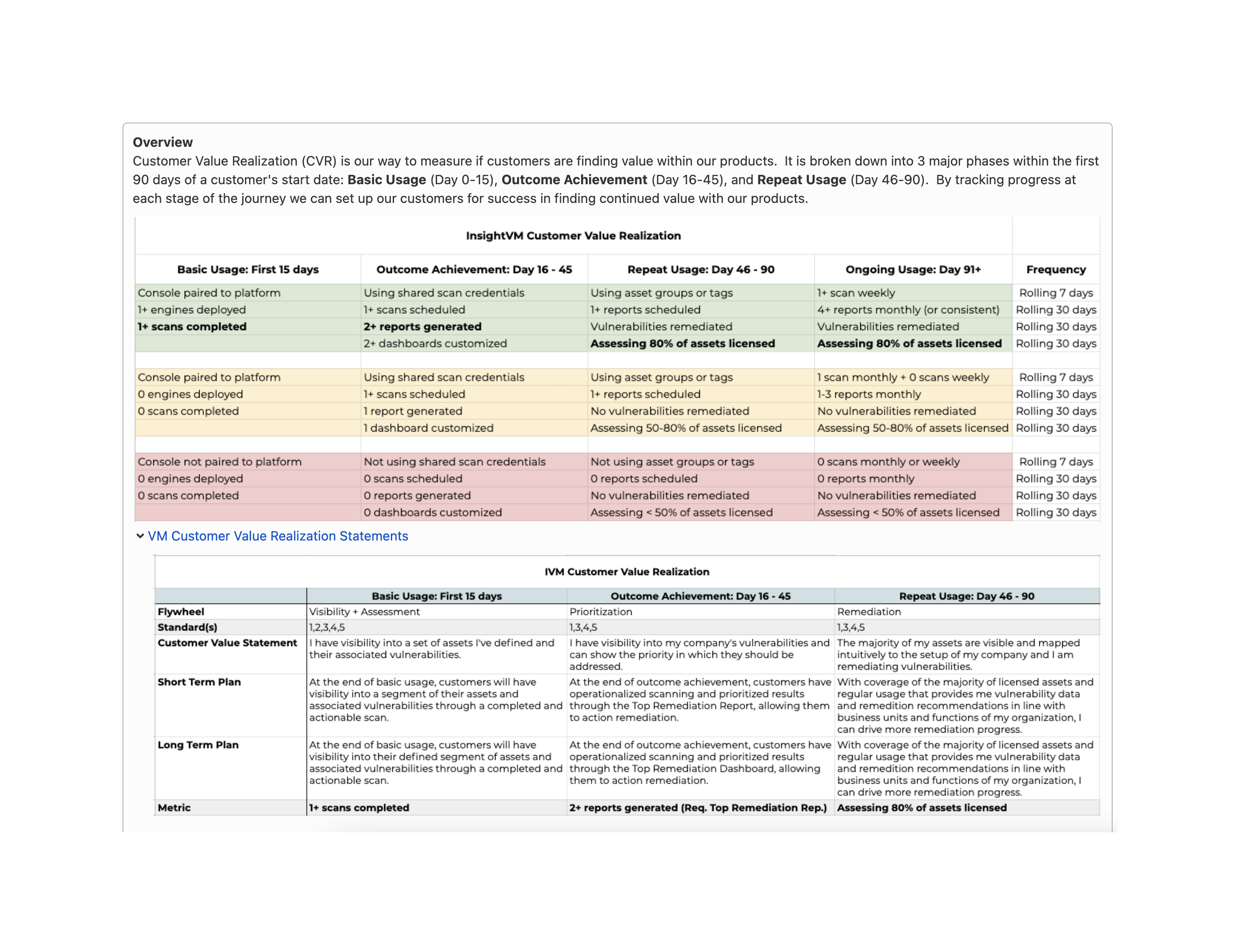Customer Value Realization (CVR) Metrics for InsightVM on a 30-60-90 day schedule.