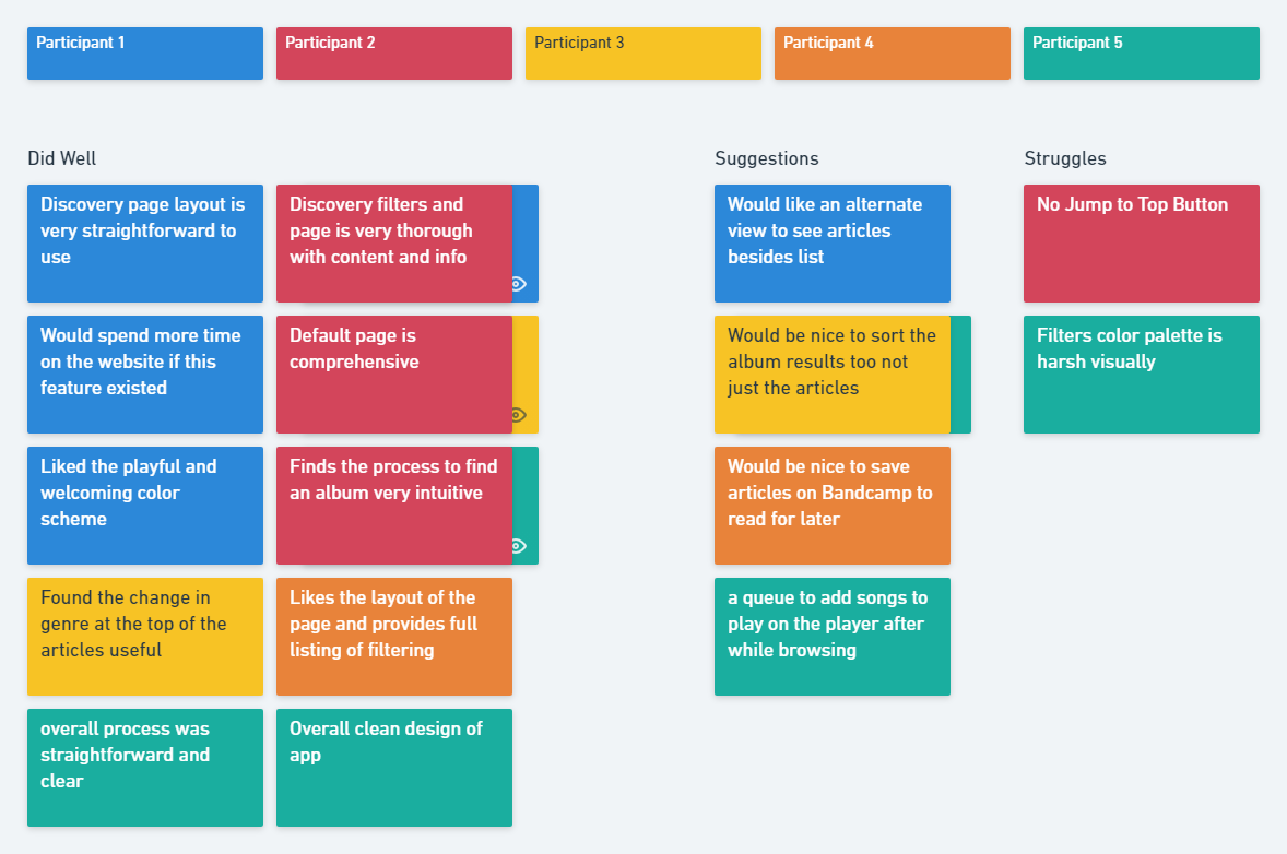 I managed to take Bandcamp's current discovery process, through the homepage and create a feature that would ideally bring more user engagement and interfacing with their blog site, the Daily, as well. This project is something I would personally use as an avid Bandcamp user and enthusiast and hopefully othere would find it useful as well.
