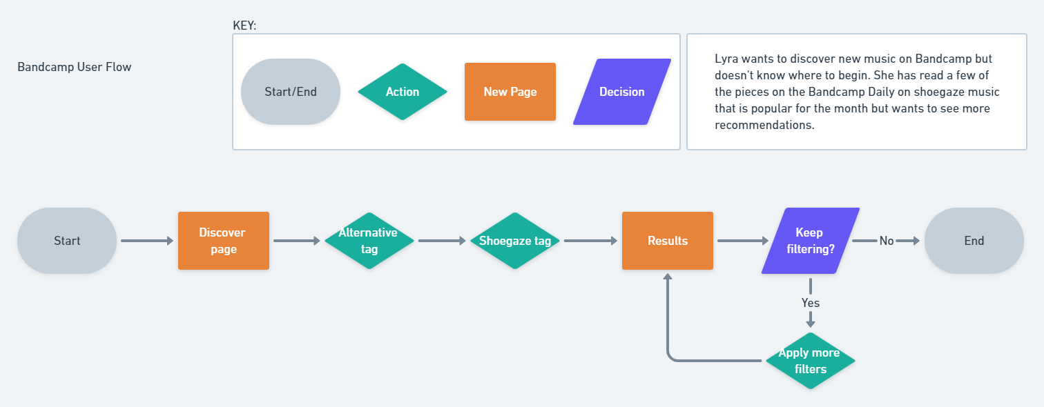 Thus we decided on creating a fully fleshed out discovery page that would allow genre exploring while also aggregating relevant Bandcamp Daily posts to that genre tag as the user clicks through so that they can find human-curated recommendations. This allows for Bandcamp and user's to both stay true to the mission and values while continuing to support burgeoning artists.