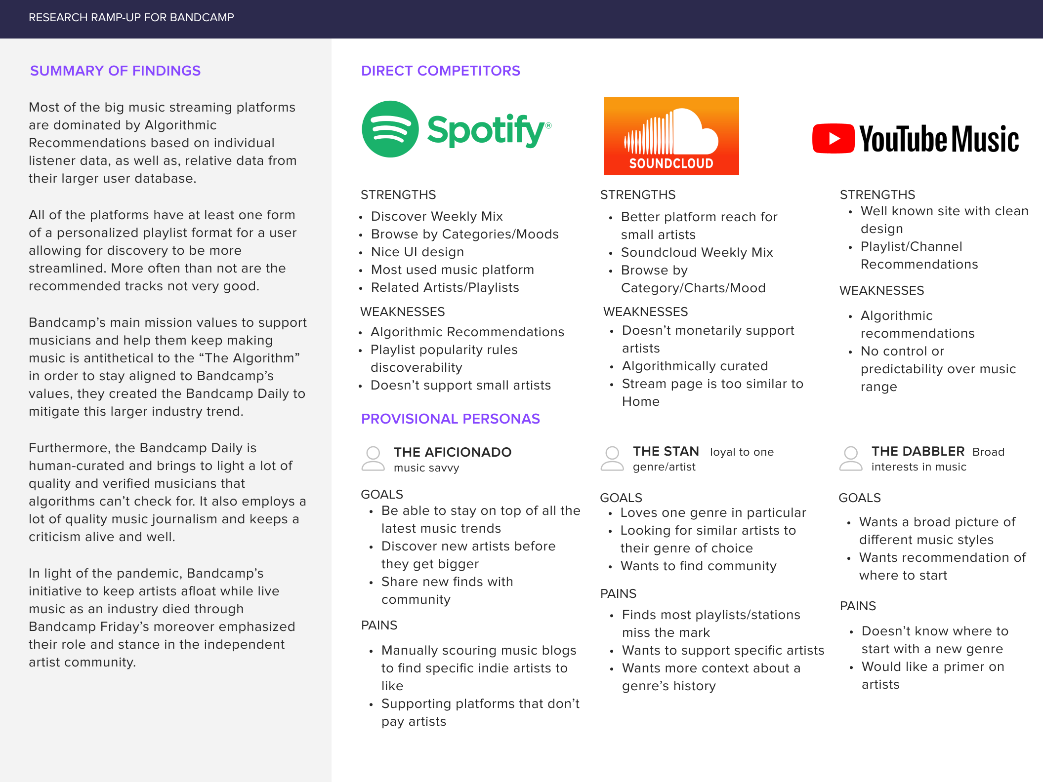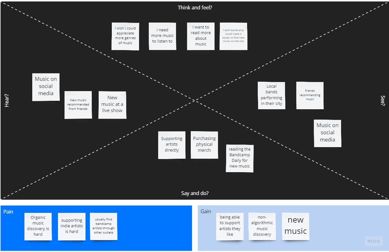 Our main research goal is to know how Bandcamp’s current processes for discovering new music works for users through the Bandcamp Daily so that we can translate it into a more user-friendly discovery experience. To remedy these problems we utilized secondary research of the existing site analytics, community mailing surveys, and one on one interviews to: