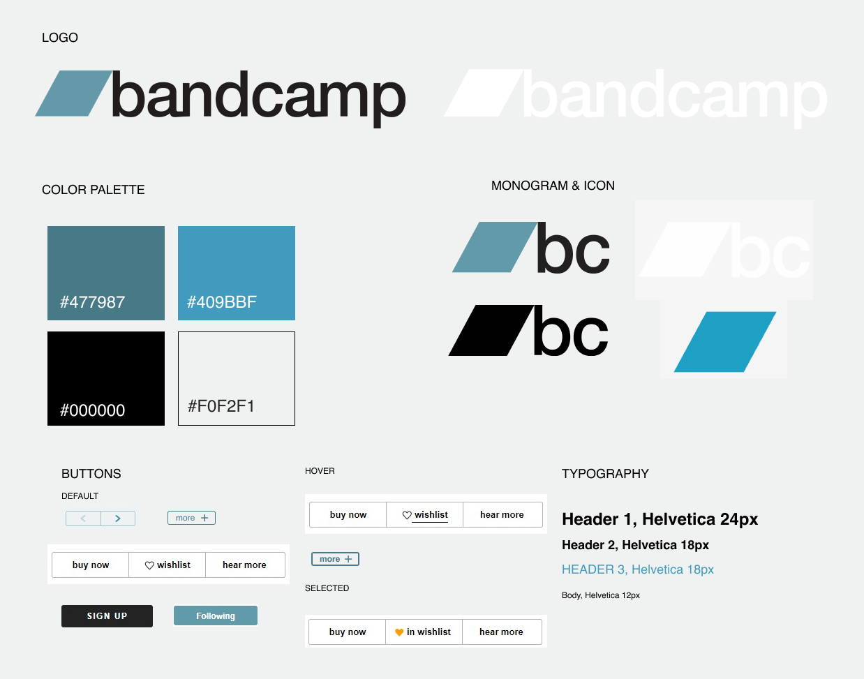 Bandcamp's current style guides and UI is purposefully very minimal and simple to stay true to the DIY ethos and reduce re-learning for users while also allowing for some personalization per artist page. I recreated their style tile on he left to display a visual representation of their brand.